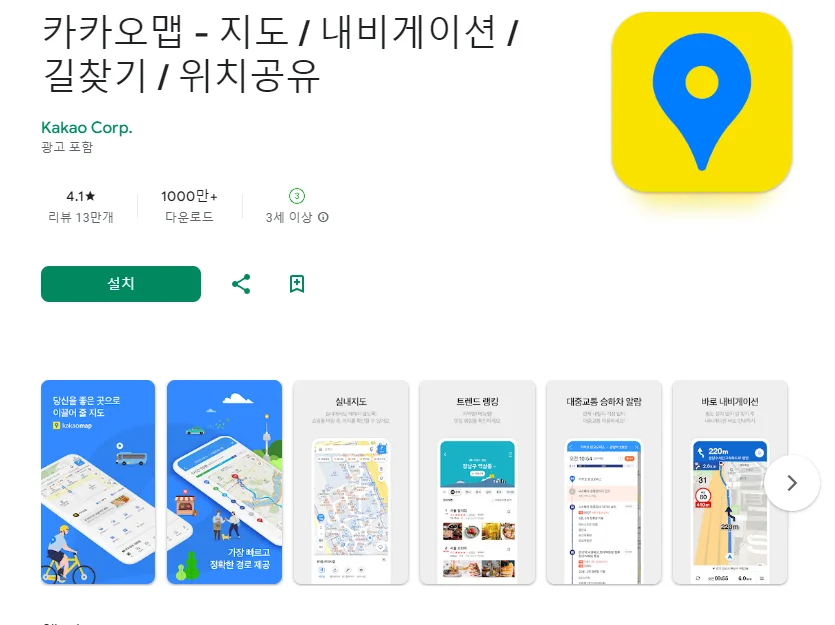 이 어플은 구글플레이스토어에서 "네비게이션"로 검색했을때 4번째로 나오는 어플입니다. 아래는 카카오맵 - 지도 / 내비게이션 / 길찾기 / 위치공유 어플에 대한 자세한 설명이니 참고하세요.
