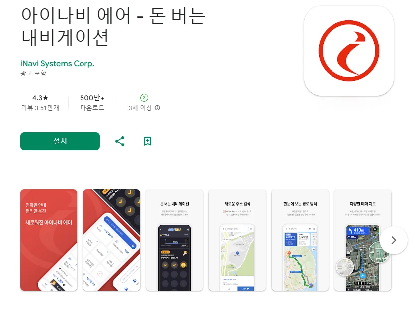 이 어플은 구글플레이스토어에서 "네비게이션"로 검색했을때 5번째로 나오는 어플입니다. 아래는 아이나비 에어 - 돈 버는 내비게이션 어플에 대한 자세한 설명이니 참고하세요.