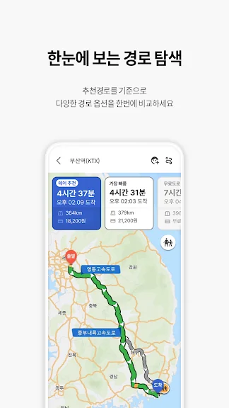 이용자들의 실제 운행 데이터와 실시간 교통정보를 바탕으로 찾은 최적의 길로 막힘없이 시원하게 달려보세요.
