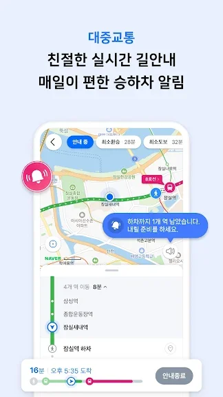 다양한 대중교통 길찾기 결과를 확인하고, 실시간 도착정보와 승하차 안내 기능으로 쉽고 편리하게 목적지까지 갈 수 있어요.