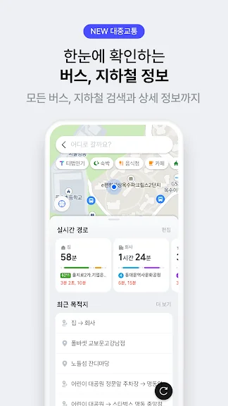 자동차/대중교통/도보/자전거 무엇을 이용하든 24시간 내에 업데이트 된 최신정보로 안내해요