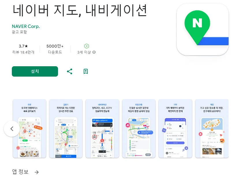 아래는 네이버 지도, 내비게이션 어플에 대한 스크린샷 정보입니다.