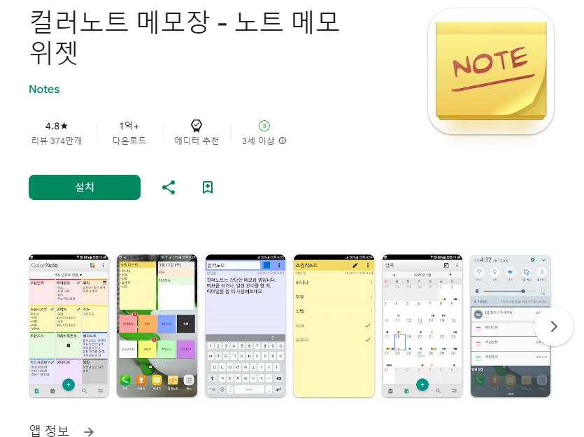 아래는 컬러노트 메모장 - 노트 메모 위젯 어플에 대한 스크린샷 정보입니다.