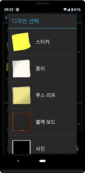 다양한 디자인- 6가지 디자인 중에서 선택: 스티커 메모, 일반 용지, 노트북 용지, 칠판, ...