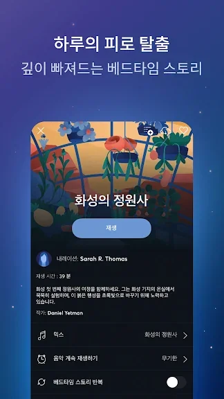 -다양한 이야기가 있습니다. 취침 시간에 하나 또는 여러 가지 행복한 이야기 속에 빠져보세요. 풍성한 맞춤형 사운드 트랙에 따뜻한 내레이션이 얹어져, 마음을 편안하게 하기 위해 작곡되었습니다.