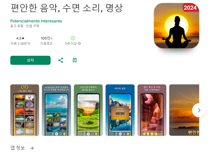 편안한 음악, 수면 소리, 명상 어플에 대한 스크린샷 정보가 필요하시다면 아래 이미지를 참고하시기 바랍니다.