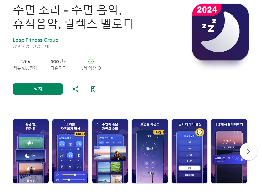 이 어플은 구글플레이스토어에서 "잠이 안올때 듣는 음악"로 검색했을때 1번째로 나오는 어플입니다. 아래는 수면 소리 - 수면 음악, 휴식음악, 릴렉스 멜로디 어플에 대한 자세한 설명이니 참고하세요.