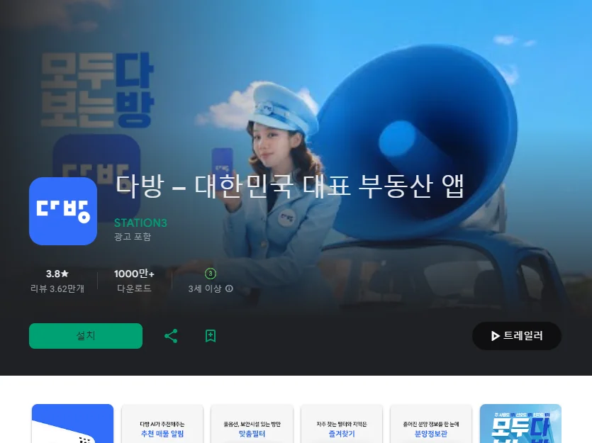 이 어플은 구글플레이스토어에서 "집구하기"로 검색했을때 1번째로 나오는 어플입니다. 아래는 다방 – 대한민국 대표 부동산 앱 어플에 대한 자세한 설명이니 참고하세요.