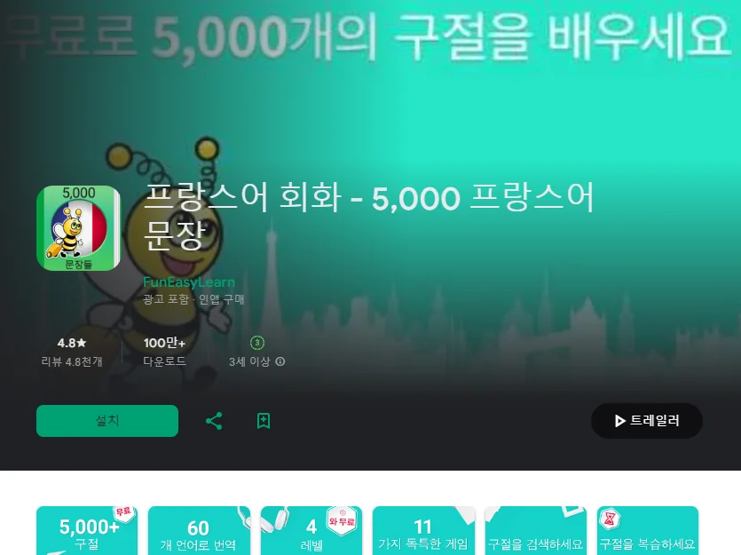 이 어플은 구글플레이스토어에서 "프랑스어 공부"로 검색했을때 1번째로 나오는 어플입니다. 아래는 프랑스어를 배우기-초보자 어플에 대한 자세한 설명이니 참고하세요.