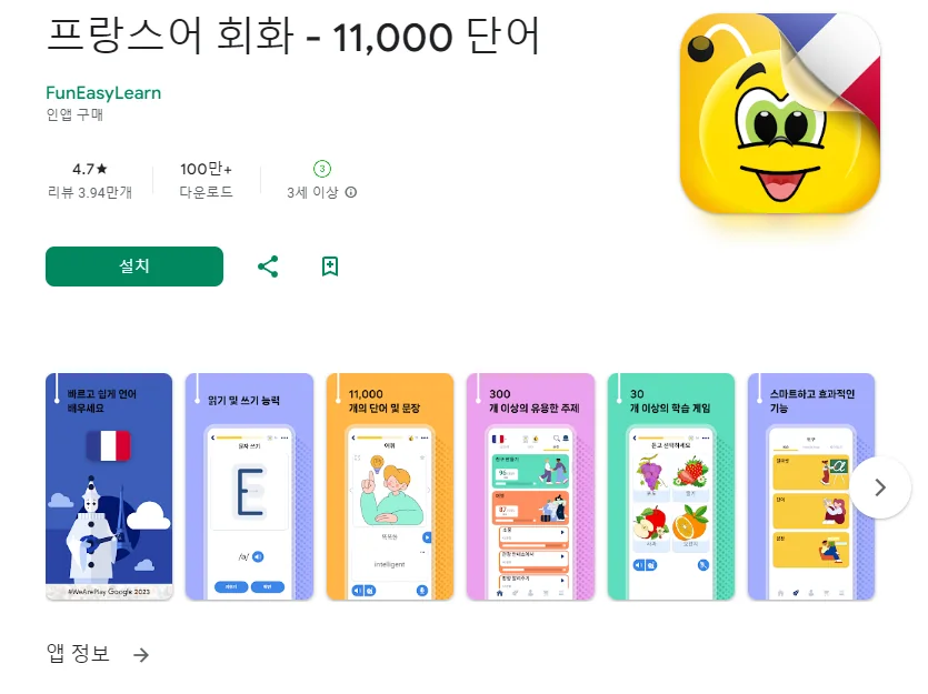 이 어플은 구글플레이스토어에서 "프랑스어 공부"로 검색했을때 2번째로 나오는 어플입니다. 아래는 프랑스어 회화 - 11,000 단어 어플에 대한 자세한 설명이니 참고하세요.