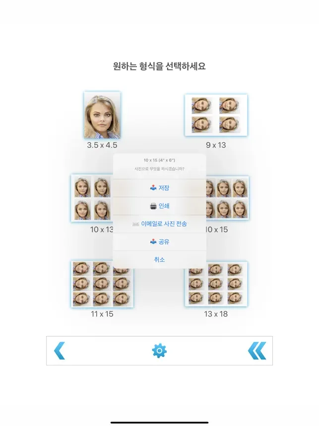 이 앱은 인화지 위의 여러 장의 여권 사진을 저장 또는 인쇄하거나 이메일로 보낼 수 있습니다. 결과 이미지는 직접 인쇄하거나 나중에 원하는 인터넷 사진관에서 주문할 수 있습니다 (앱으로부터가 아님).