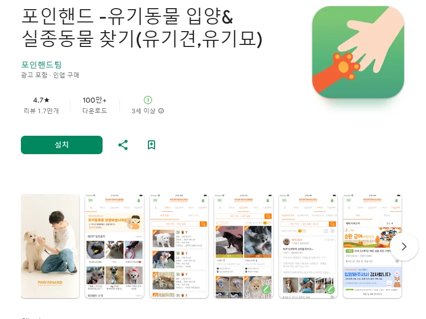 아래는 포인핸드 -유기동물 입양&실종동물 찾기(유기견,유기묘) 어플에 대한 스크린샷 정보입니다.