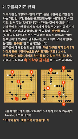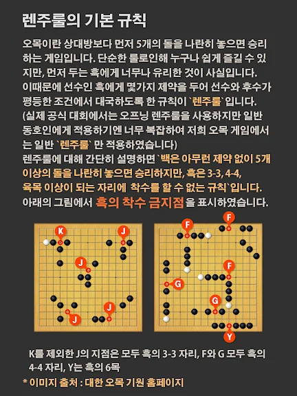 (실제 공식 대회에서는 오프닝렌주룰을 사용하지만 일반 동호인에게 적용하기엔 너무 복잡하여 저희 게임에서는 일반 ‘렌주룰’만 적용하였습니다.)