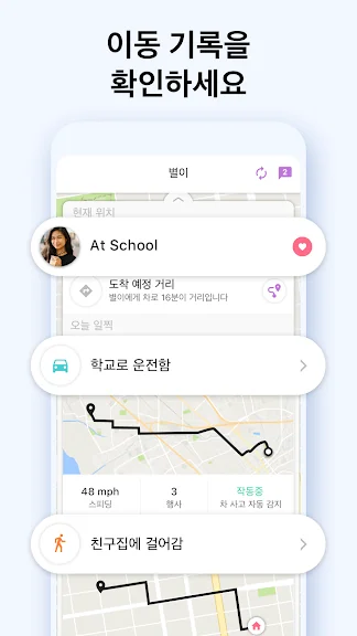 위치 내역: 일별로 정리된 친구와 가족의 이동 내역을 지속적인 타임라인으로 확인하세요. 과거 운행을 간편하게 검토하고 가족 구성원이 특정 위치에서 보내는 시간까지도 확인할 수 있습니다.