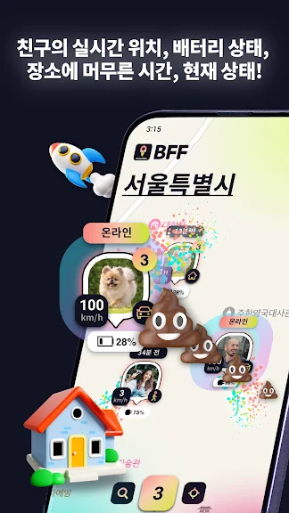 친구와 자동차 여행을 떠나시나요? 하우스 파티에 참석하시나요? 연인을 위해 깜짝 놀랄 생일 이벤트나 데이트를 준비하시나요? 친구의 실시간 위치, 배터리 상태, 장소에 머무른 시간, 현재 상태(학교, 직장, 집, 운전, 운동, 영화관, 샤워, 화장실 등)를 확인해 보세요.