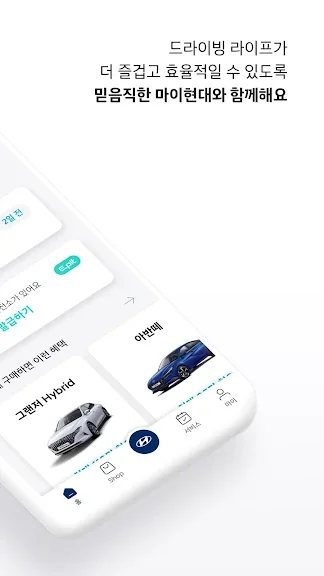 차량 정보와 유지비 관리는 물론 쇼핑, 서비스 예약까지 마이현대 하나로 가능해요.