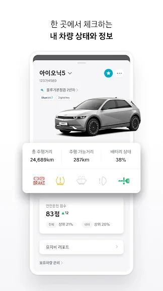 - 총 주행거리, 배터리 상태, 소모품 정보 등 차량 정보를 확인/관리해요