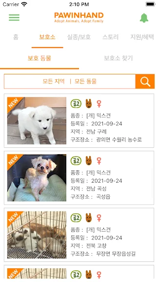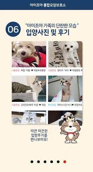 아래는 아이조아요양보호소-강아지파양 보호소, 고양이 유기견입양 어플에 대한 스크린샷 정보입니다.