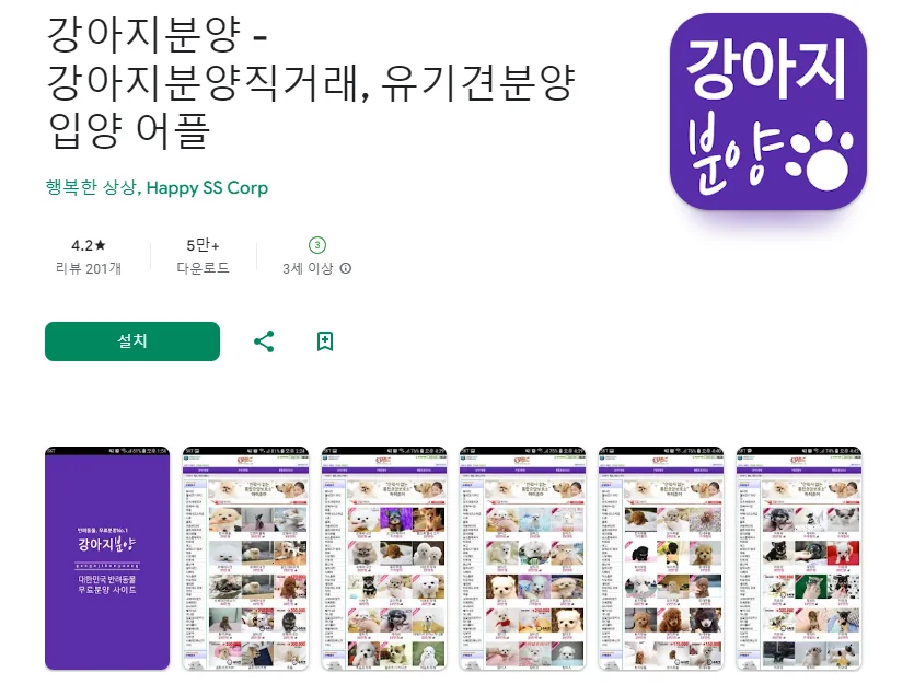 이 어플은 구글플레이스토어에서 "강아지 무료 분양"로 검색했을때 3번째로 나오는 어플입니다. 아래는 강아지분양 - 강아지분양직거래, 유기견분양 입양 어플 어플에 대한 자세한 설명이니 참고하세요.