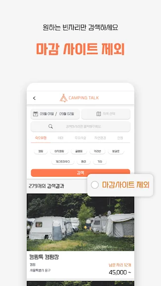 - "마감 캠핑장 제외" 버튼을 통해 노출 미노출 선택가능