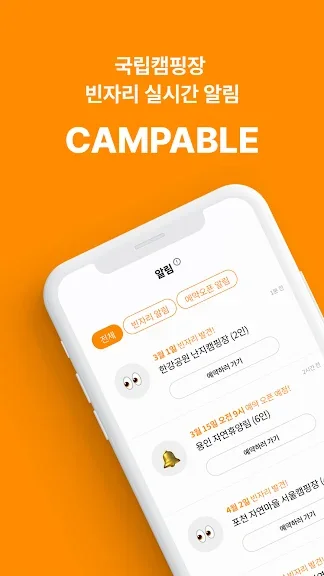 아래는 캠퍼블 CAMPABLE - 캠핑장 빈자리&예약 오픈알림 어플에 대한 스크린샷 정보입니다.