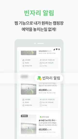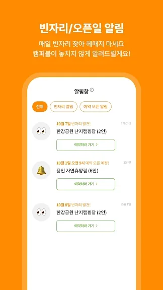 시간낭비 없이 인기 캠핑장의 빈자리에 대한 알림을 받아보실 수 있습니다.
