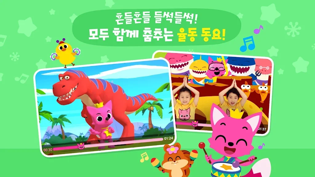 신나게 노래 따라 부르며 춤출 수 있는 핑크퐁 상어가족 인기동요 부터 시작해 동물 동요, 자동차 동요, 공룡 동요 등 즐거운 콘텐츠들이 많아요!