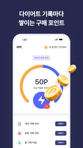 - 꾸준히 하는 것이 제일 어려우니까, 매일 식단, 운동, 물, 수면 시간을 기록할 때마다 포인트를 적립해드려요.