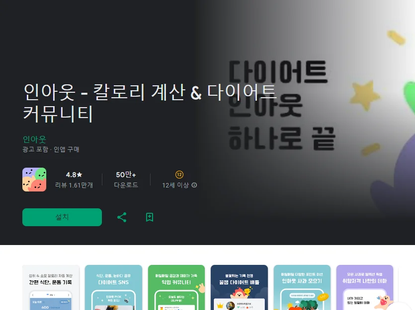 이 어플은 구글플레이스토어에서 "다이어트 식단"로 검색했을때 1번째로 나오는 어플입니다. 아래는 인아웃 - 칼로리 계산 & 다이어트 커뮤니티 어플에 대한 자세한 설명이니 참고하세요.