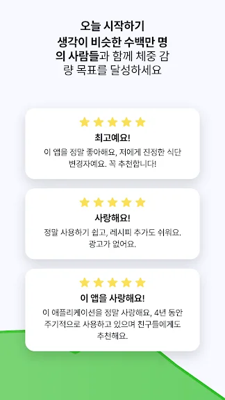 이외에도 여러분들이 건강하고 즐겁게 다이어트에 도전할 수 있도록 다양한 기능을 준비 중이에요. 필요한 기능이 있다면 주저말고 피드백 남겨주세요. 좋은 리뷰와 의견은 저희에게 큰 힘이 됩니다.