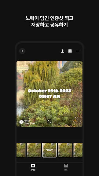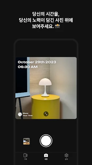 Show Your Time은 일상 속 노력의 순간을 특별하게 기록해주는 타임스탬프 카메라 앱입니다. 미라클 모닝으로 시작하는 하루든, 운동이나 다이어트를 하는 순간이든, 여러분의 노력은 언제나 빛나야 합니다. Show Your Time은 이 모든 순간을 멋지게 담아냅니다.