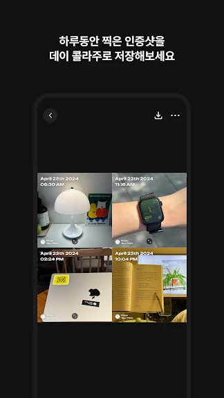이 앱의 가장 큰 매력은 감각적이고 세련된 디자인입니다. 간편한 인터페이스 덕분에 하루의 소중한 순간들을 손쉽게 촬영하고 저장할 수 있으며, 주간 및 월간 기록을 통해 쌓인 노력을 한눈에 확인할 수 있습니다. 8가지 다양한 프레임 옵션으로 사진에 포인트를 주어 더욱 매력적으로 만들 수 있습니다. 촬영한 타임스탬프 사진은 인스타그램 스토리 등 소셜 미디어에 쉽게 공유할 수 있어, 친구들과 순간을 나누는 재미도 더해줍니다.