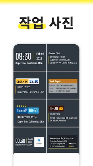 Timemark는 사용자 친화적인 인터페이스를 제공하여, 언제 어디서나 간편하게 사진을 촬영하고 출근 카드로 활용할 수 있습니다. 위치 제한 없이 현장에서 사진을 찍는 것은 물론, 다양한 해상도 설정과 필터, 편집 도구를 통해 사진을 더욱 멋지게 꾸밀 수 있습니다.