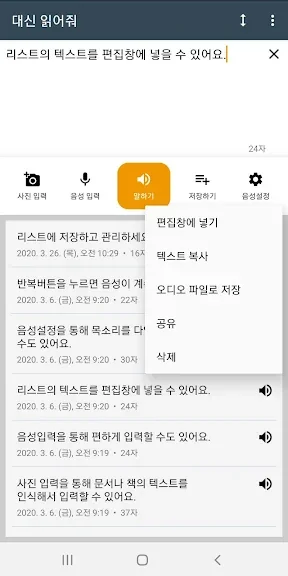 아래는 대신 읽어줘: 텍스트 음성 변환 어플에 대한 스크린샷 정보입니다.