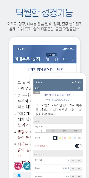 사용자는 북마크, 하이라이팅, 노트 작성 기능을 통해 성경을 개인화하여 더욱 깊이 있는 공부를 할 수 있습니다. 또한, 친구나 가족과 쉽게 성경 구절을 공유하여 함께 묵상하고 교류할 수 있습니다.