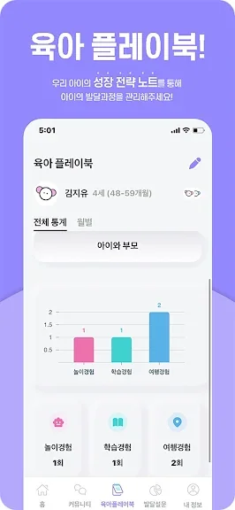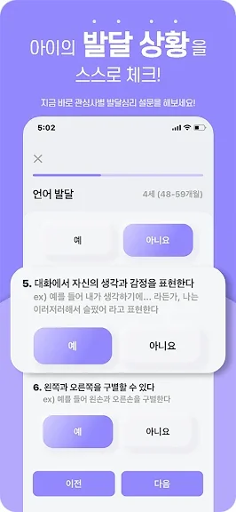아이의 신체부터 사회성까지 여러 단계의 발달과정을 간단한 발달심리 설문을 통해 스스로 체크해 볼 수 있어요! 발달심리 설문 통계에 따라 맞춤 놀이 / 학습 콘텐츠를 제공해 드려요!