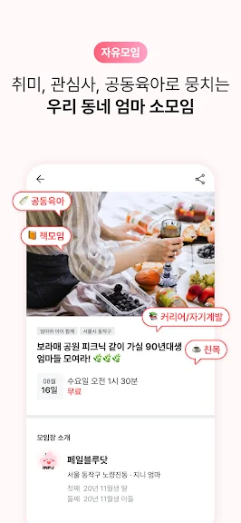 - 말하지 않아도 엄마들끼리는 통하는 게 있으니까! 동네 산책모임, 취미 모임, 공동육아 모임을 직접 만들고 참여해요.