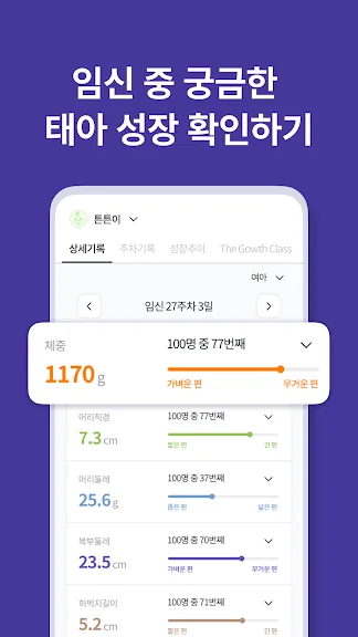 3) 몸무게, 머리둘레 등 5가지 태아성장수치를 통해 뱃속에서 잘 크고 있는지 그래프로 확인하세요.